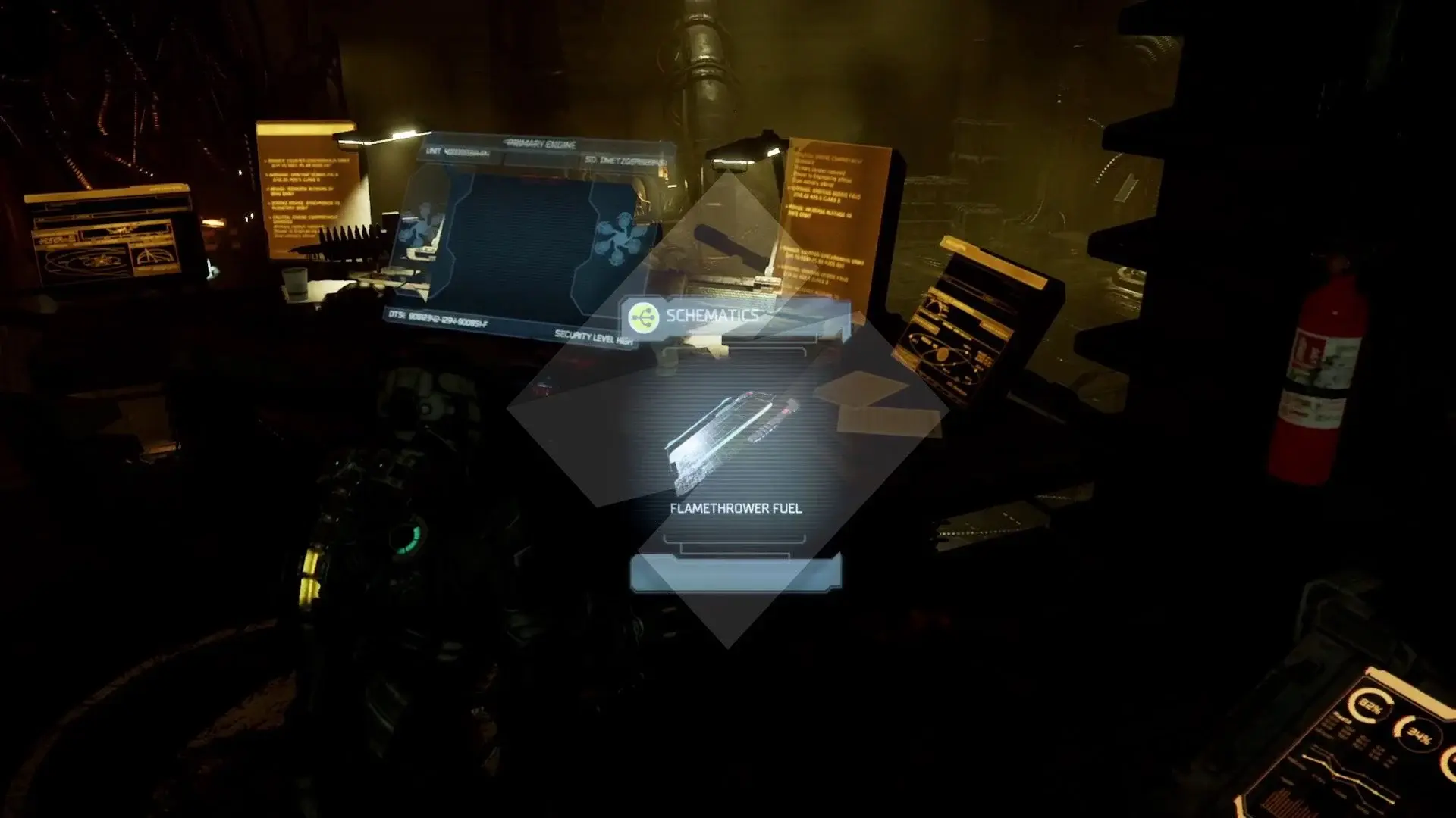 - Flamethrower fuel schematic: Found in Engineering; Floor 3 – Engine Room (right next to the button to reignite the engines).