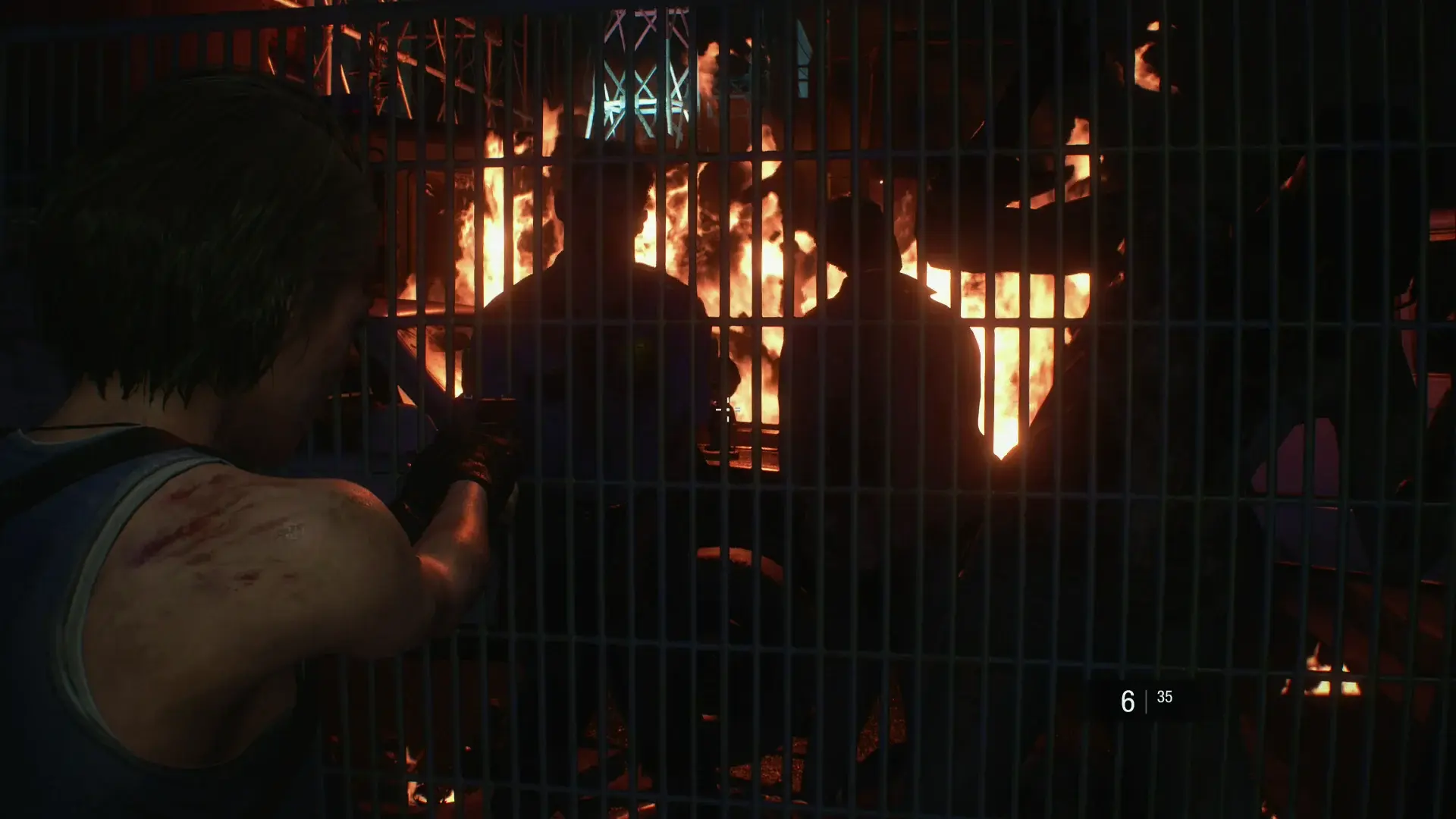 Once you put out the fire, VERY CAREFULLY inch around the corner. Look to the vents above and shoot it before you go too far and end the demo.