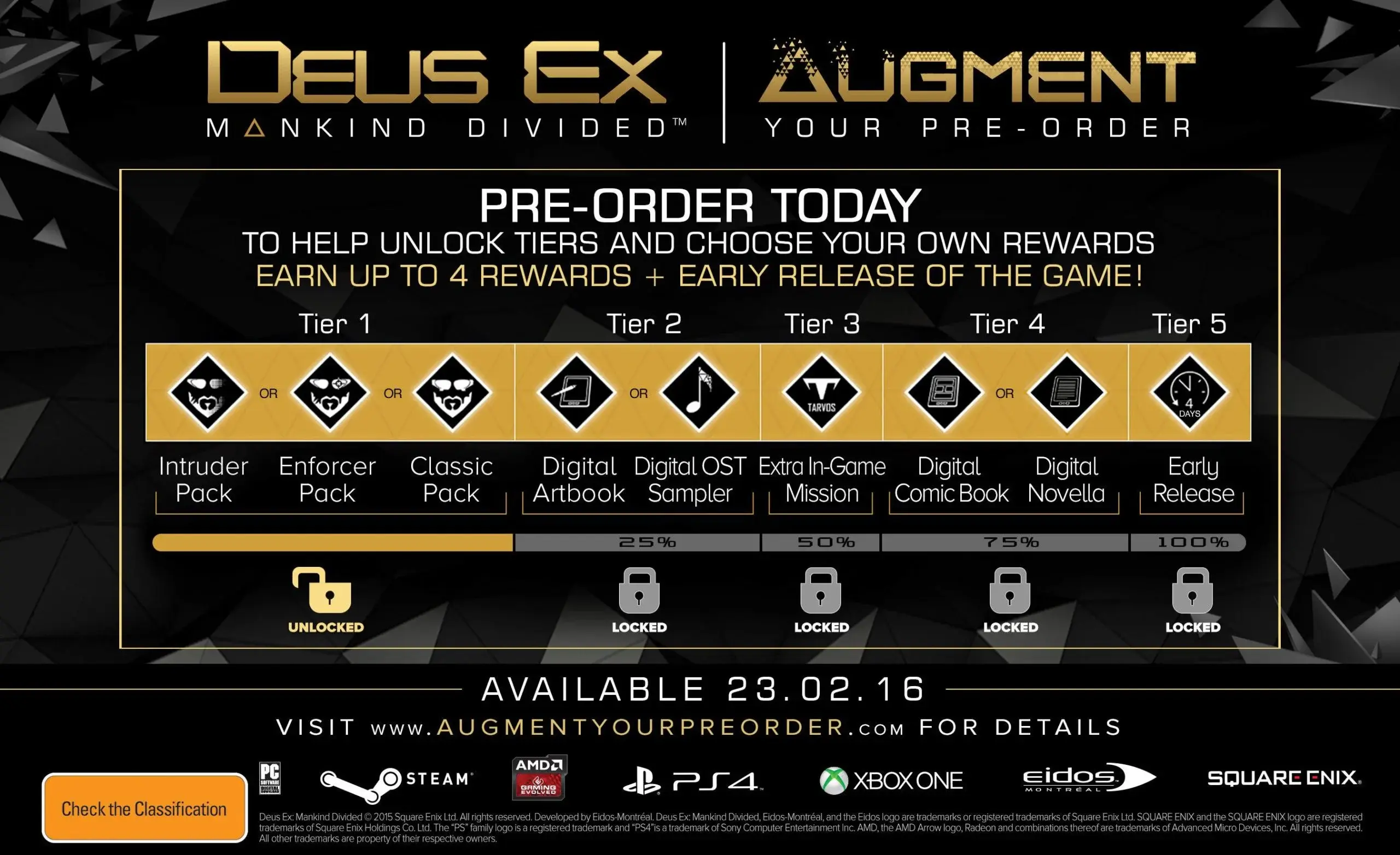 Square Enix today announced Deus Ex: Mankind Divided‘s four-tiered pre-order system called “Augment Your Pre-order”, which offers a choice of rewards based on the number of global pre-orders taken for the title.