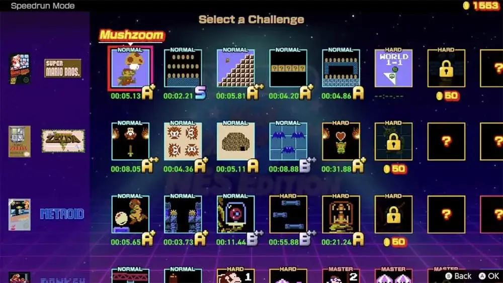 Challenges range from 5-6 seconds long (grab the first mushroom in Super Mario Bros.‘ Level 1-1), to minutes long (complete all of Super Mario Bros.‘ Level 1-1). An initial screen will show you exactly how the challenge can be completed, and some challenges will even feature on-screen arrows to help you succeed (in the case of reaching Zelda‘s first dungeon).