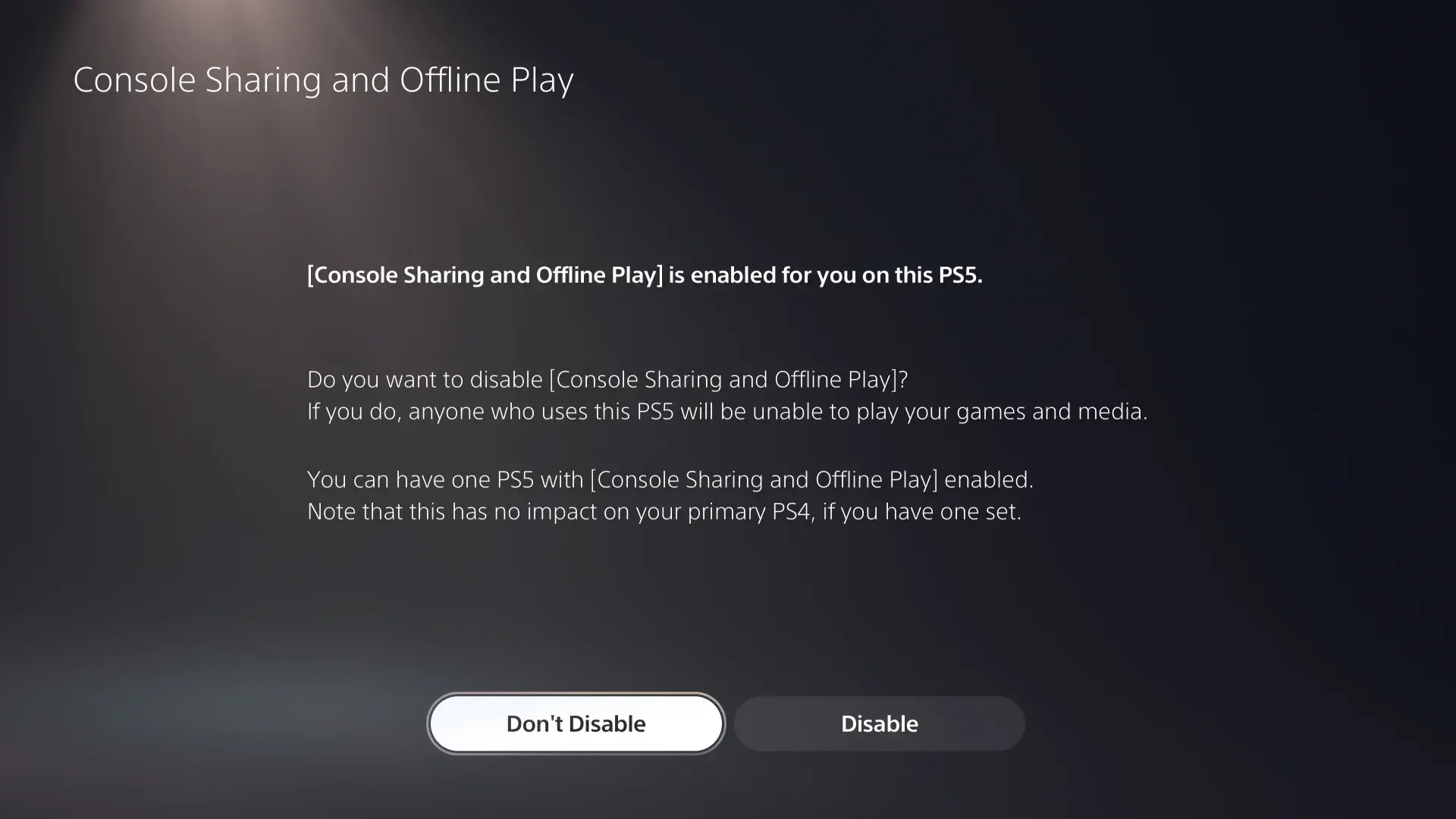 The PS5 changes it up when it comes to game sharing. Different from what we discovered about the Xbox One and Xbox Series consoles, a PlayStation user can have both a Primary PS4 and a PS5 with a feature called Console Sharing and Offline Play enabled. Despite a name change, the features across each PlayStation generation appears to be the same, meaning that anyone who logs into your Primary PS4 and/or Console Sharing PS5 will enjoy the same game entitlements as you.
