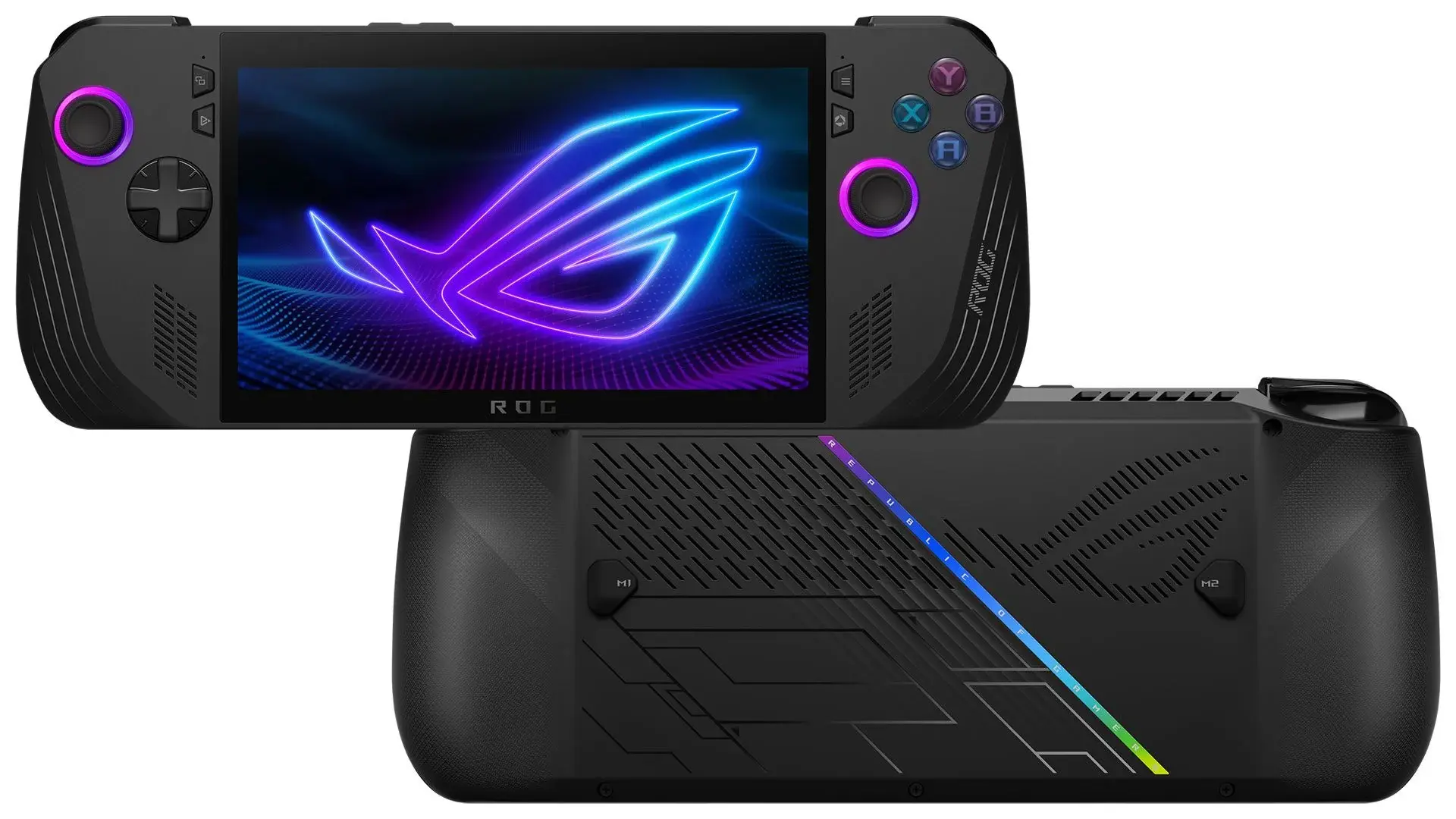 - Control and Input: A B X Y buttons, D-pad, L & R Hall Effect analog triggers, L & R bumpers, View button, Menu button, Command Center button, Armoury Crate button, 2 x assignable grip buttons