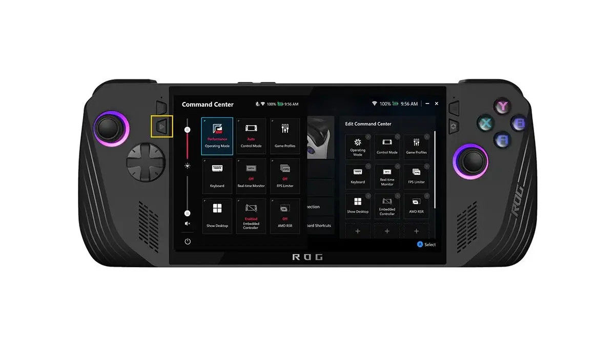- Control and Input: A B X Y buttons, D-pad, L & R Hall Effect analog triggers, L & R bumpers, View button, Menu button, Command Center button, Armoury Crate button, 2 x assignable grip buttons