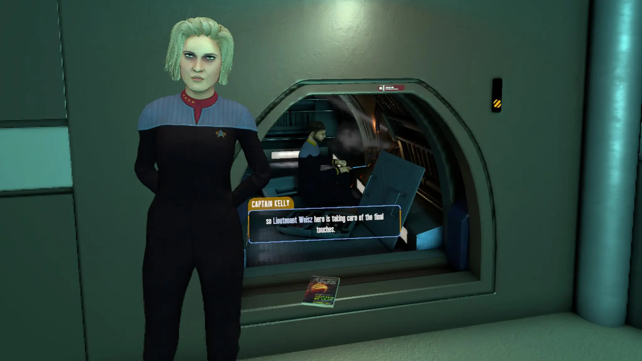 Infection begins on the hull of a deep space station, offering up a truly Trek experience as Ferak works to stop a rogue asteroid from wreaking havoc. Not long after, you’re in the station’s shuttle bay, helping another officer repair a short-range shuttle, also managing to sneak a peak of the Lumen as she heads into transporter range to pick you up. Hell, you can forget about making a choice on Infection‘s title screen, instead opting to explore the bridge of a Defiant-class ship.